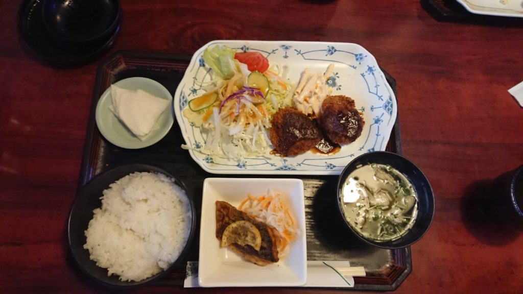 やってきました! 「豆の木」の日替わり定食! 見てるだけでおいしさが伝わってきます!!メインのヒレカツ・ムロアジのハーブ焼き・サラダ・ご飯・お味噌汁・漬物もついて嬉しすぎます!!!